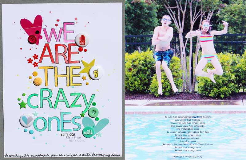 For the title page, stamp the title using black Memento Ink and let it dry for a few minutes. Watercolor in the letters and let dry again for thirty minutes or so. Sprinkle various embellishments throughout the page until you find an arrangement you like. Adhere embellishments using glue dots.